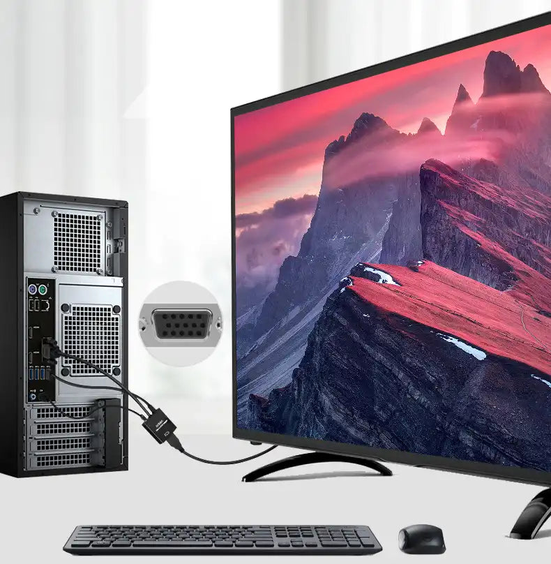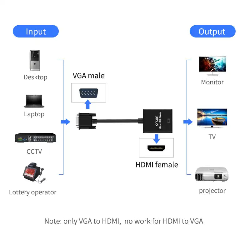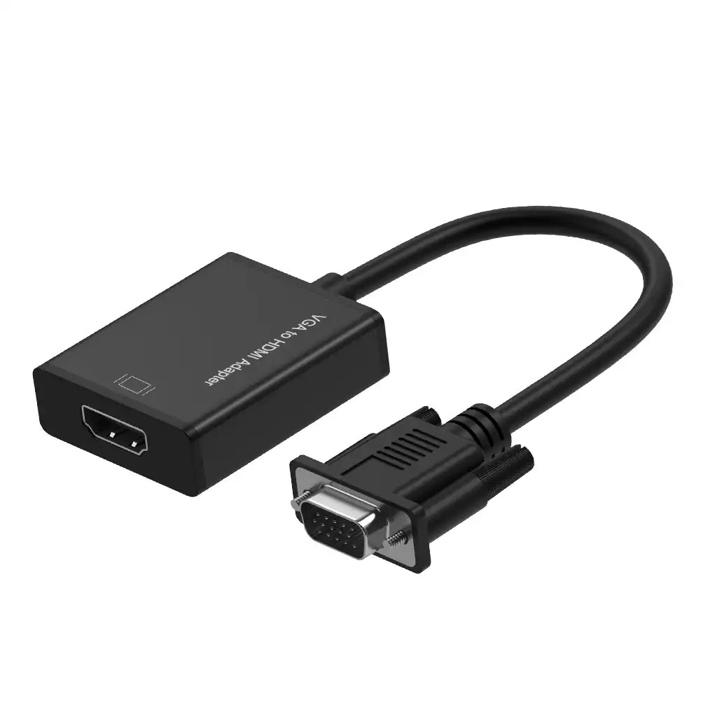 This VGA to HDMI Adapter allows you to convert analog VGA output from most PCs and laptops to your HDTV. Our adapter features a built in audio cable and usb cable so you only need one connection to connect both video and audio signals from your computer to your TV.Share your video/audio/data from computers or old-styled notebooks, desktops,laptops that has only VGA ports to any HDMI-equiped devices like HDTVs, monitors, displayers for big screen viewing.
