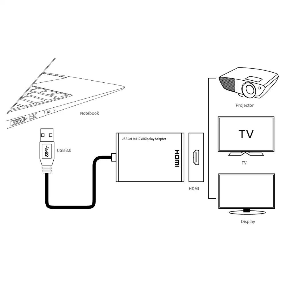 The USB 3.0 to HDMI Display Adapter allows a standard HDMI Display to be connected to a Windows. PC via a USB 3.0/2.0 connection. An adapter is required for every monitor you wish to connect via USB, up to six adapters per PC.