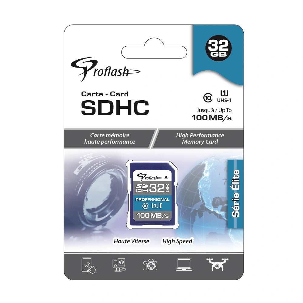 Capture and store your memories with confidence using the Proflash 32GB SDHC SĂ©rie Ălite memory card. Designed for high-speed performance, this Class 10 UHS-I card delivers read speeds up to 100MB/sâperfect for Full HD video recording, high-resolution photography, and smooth data transfers.