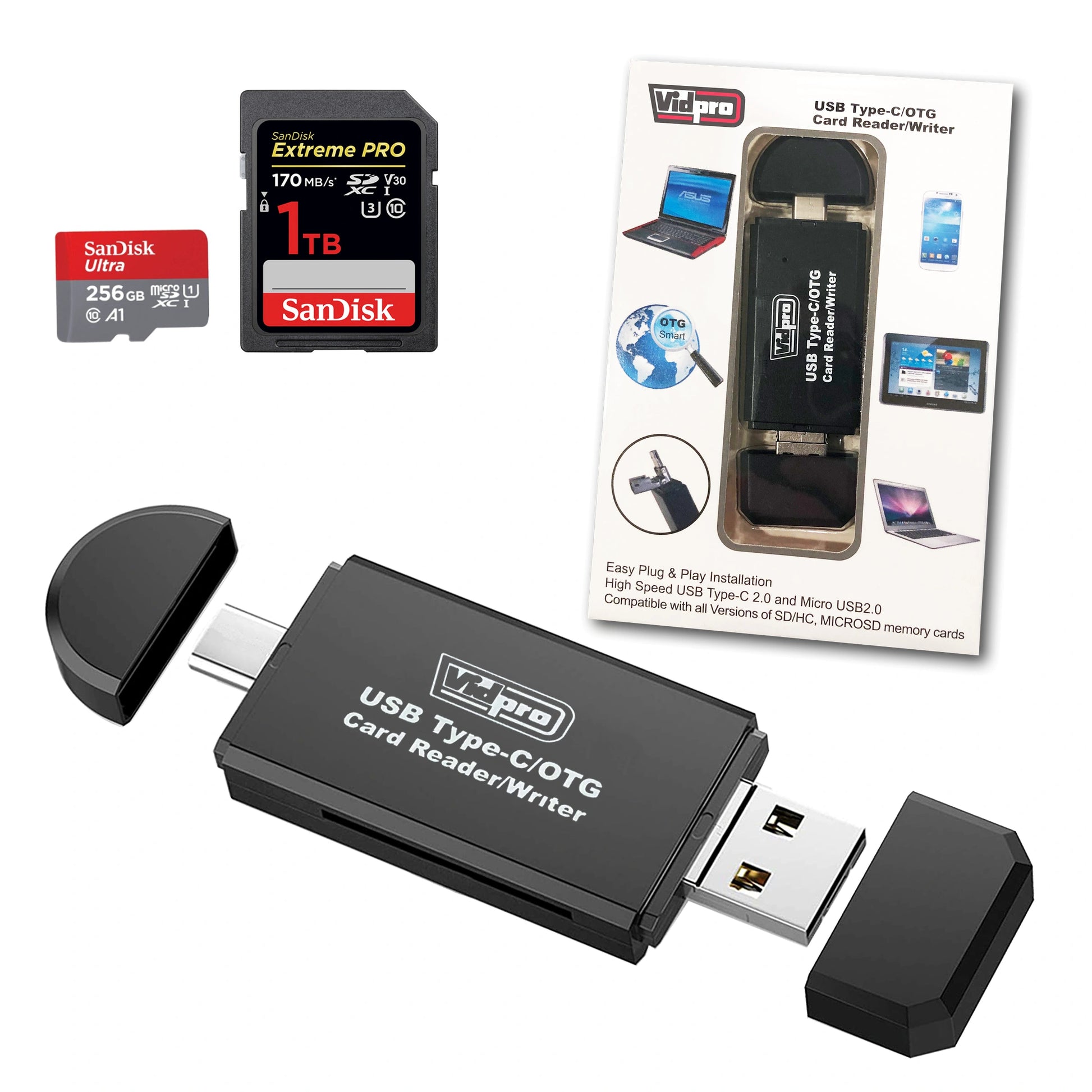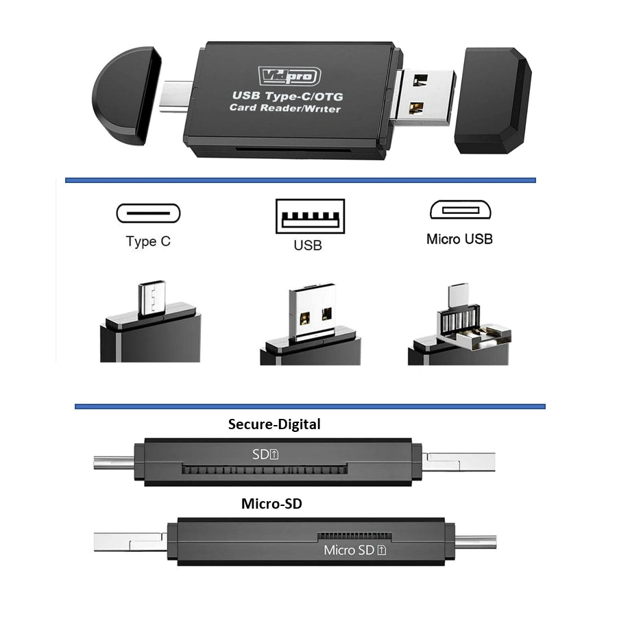 Vidpro Type-C Card Reader with USB 2.0 and Micro USB Connectors for SD & MicroSD Memory Cards