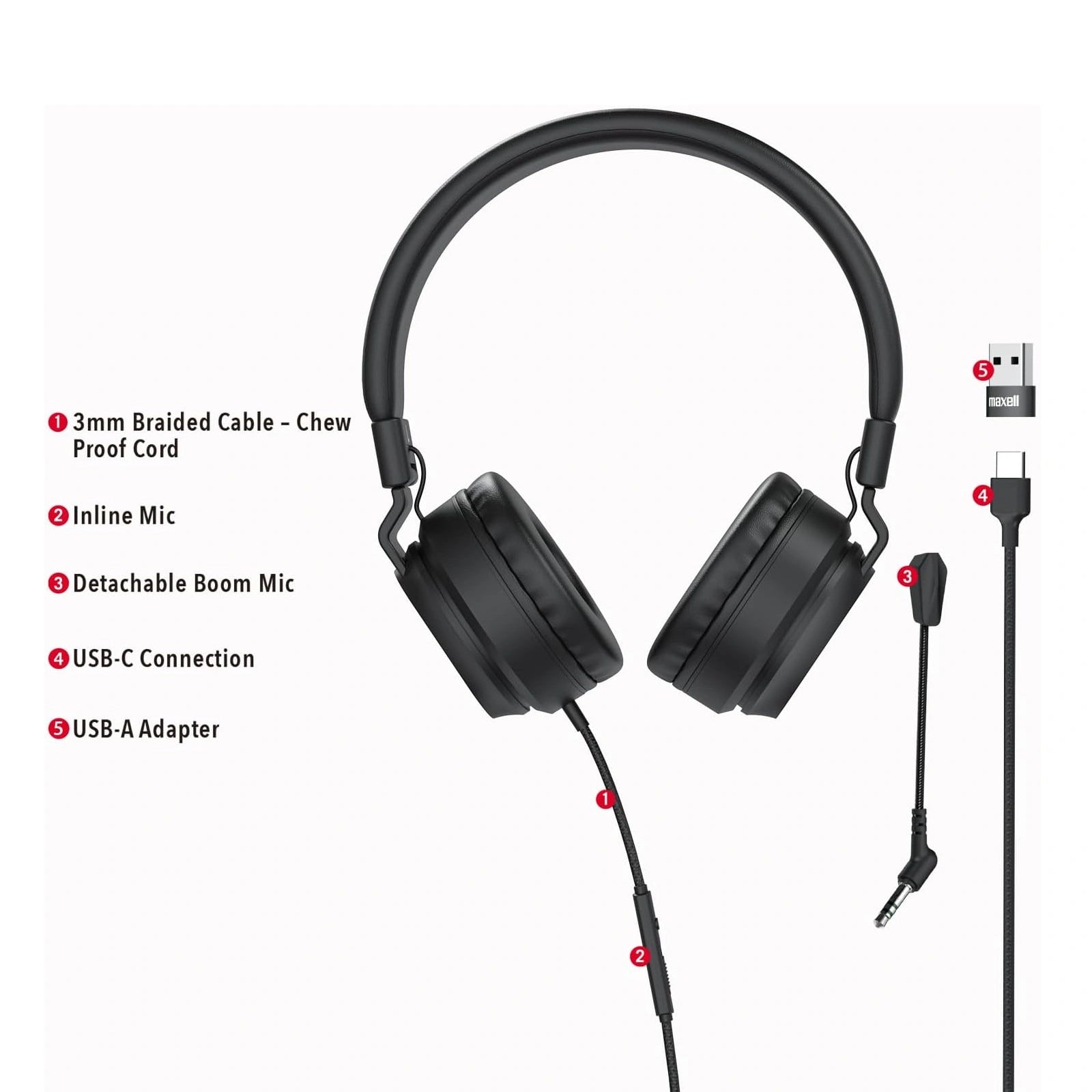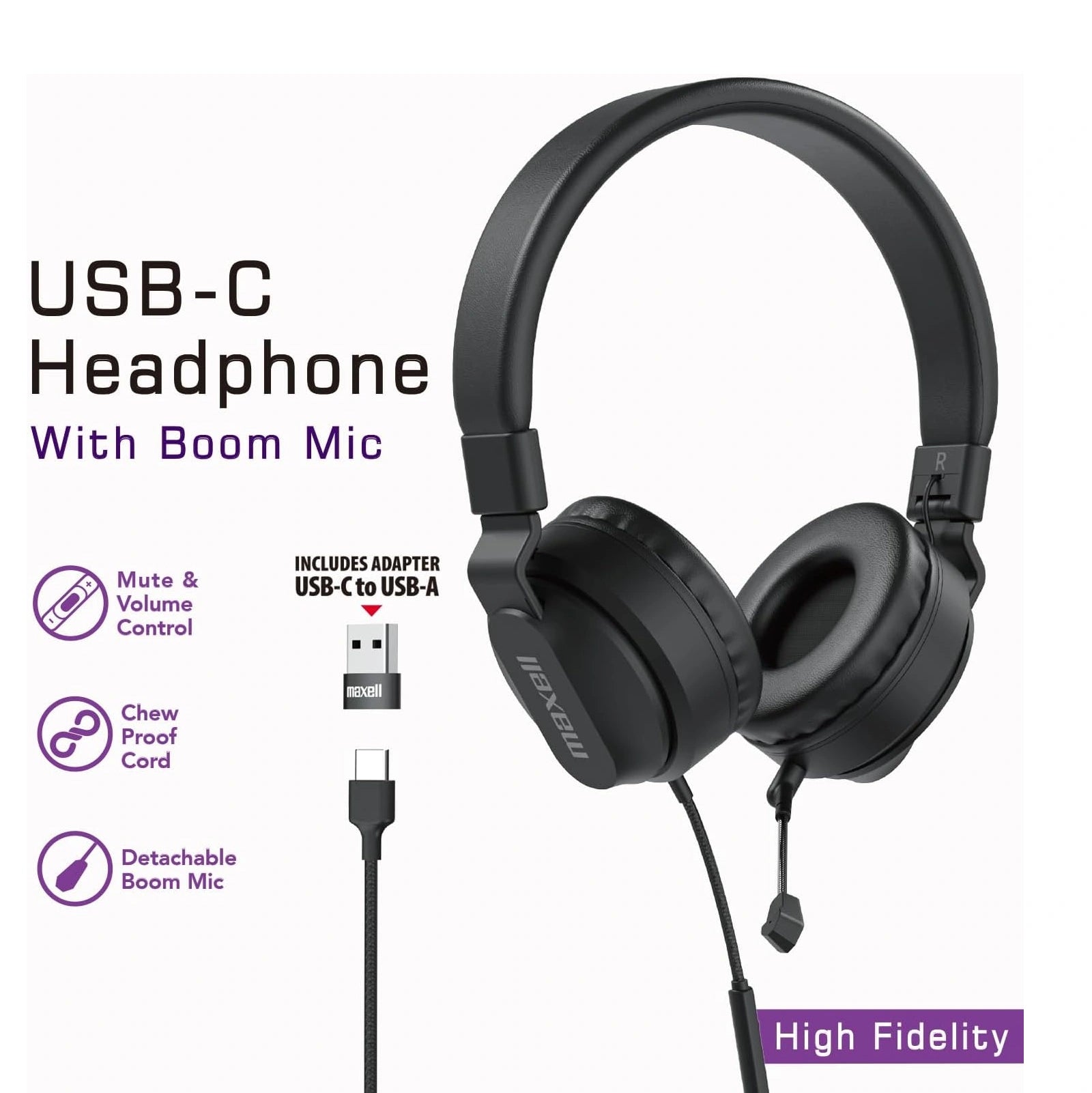 Maxell USB-C Headphone With Boom Mic & USB-A Adapter Model HPBMT1